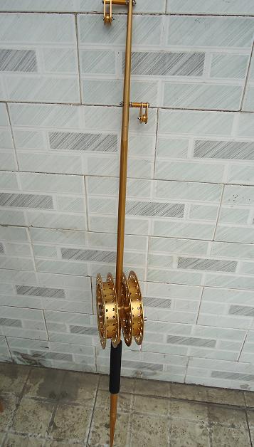 5、在主線上粘有膠布印記的地方(即掛過(guò)誘餌小袋的地方)掛上有釣餌的口線, 隨主線送到喂窩處垂釣。 6發(fā)現(xiàn)浮子被子拖入水中時(shí),握著手柄將繞線器用力往上一抬,主線牽動(dòng)釣線移 位,魚兒便上鉤了,再搖動(dòng)繞線器,將魚兒收回岸邊摘下。 三、過(guò) 河 釣 技 巧 (一)、單線雙放 1左線輪。一般設(shè)定安裝主放線,應(yīng)在上方。在牽線過(guò)河時(shí),將左線輪的主 線拉出一小部分穿過(guò)抬竿的左上滑輪后,再由上向下穿過(guò)背竿滑輪,將線頭上打一個(gè) 稍微比上滑輪大點(diǎn)的小圈掛在抬竿的右上滑輪上,**實(shí)現(xiàn)了單線雙放的設(shè)置。這時(shí), 你拉動(dòng)主竿或背竿,用姆指輕輕壓住線輪外緣,**可輕松實(shí)現(xiàn)一線雙放的功能; 2右線輪。一般安裝主釣線,用于懸掛仕掛牌,應(yīng)在下方。當(dāng)背竿拉到對(duì)岸 適當(dāng)位置時(shí),將主釣線穿過(guò)右上滑輪后與主放線進(jìn)行雙線連接,適當(dāng)松緊雙線,**完 成了主線的架設(shè)。 四、抬釣各部件之標(biāo)準(zhǔn)名稱(如圖)